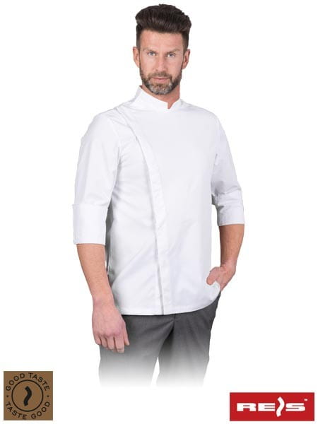 Bluza kucharska z długim rękawem, męska. - 100% poliester typu T400 - gramatura 190 g/m2 - zapinana na osiem zatrzasków - kołnierz w formie stójki - kieszonka na długopis na patce zasłaniającej zapięcia - rękawy zakończone niewielkimi rozcięciami dzięki czemu po wywinięciu tworzą elegancki mankiet - zastosowanie wstawki z elastycznego materiału na plecach zapewnia komfort użytkowania - pranie w temperaturze do 60°C