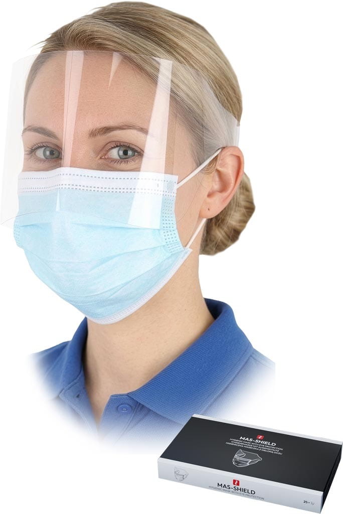 Maseczka higieniczna z osłoną oczu. - maseczka: trójwarstwowa włóknina 100% polipropylen o gramaturze warstw 25 g/m2 + 25 g/m2 + 25 g/m2 - osłona oczu: tworzywo sztuczne 100% polietylen - mocowana za pomocą elastycznej gumki - metalowa klamra na wysokości nosa - pakowana po 25 szt. w opakowaniu - maseczka higieniczna służy przestrzeganiu czystości poprzez zapobieganie przedostaniu się wydzieliny z ust i nosa do środowiska oraz utrudnienie przeniesienia zabrudzeń z dłoni na twarz - produkt nie stanowi środka ochrony układu oddechowego ani wyrobu medycznego