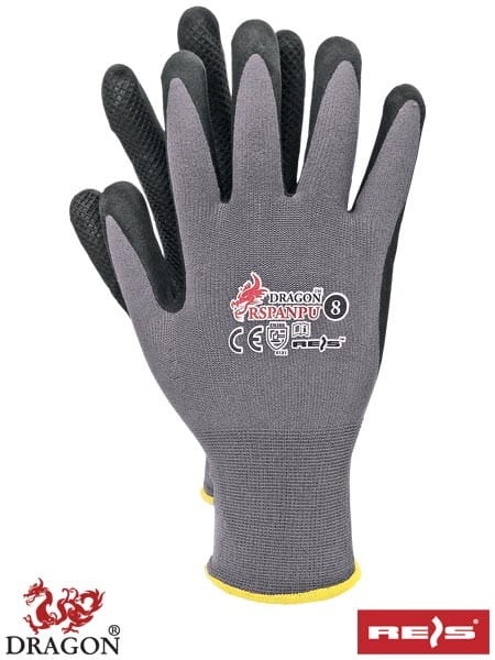 Rękawice ochronne. - dzianina: połączenie nylonu z elastanem (ścieg 15) - powlekane poliuretanem na bazie wody z wzorem w kształcie plastrów miodu - specjalne mini wgłębienia w powleczeniu zapewniają lepszą chwytność - zakończone ściągaczem - zapewniają manualność oraz doskonałe czucie trzymanego przedmiotu - wykazują bardzo dużą elastyczność, a tym samym odporność na rozciąganie - wykorzystywane do ogólnych prac mechanicznych - zgodne z normami EN388 (poziomy odporności: 2 1 3 1 X) oraz EN420
