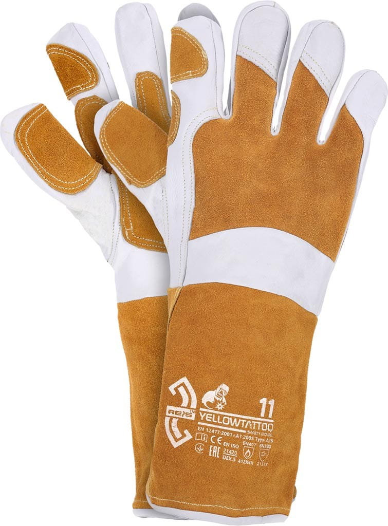 Rękawice spawalnicze. - skóra bydlęca dwoinowa w kolorze miodowym połączona ze skórą bydlęcą licową - długość rękawicy 35 cm - szyte trudnopalnymi i odpornymi na gorąco nićmi z kevlaru - część chwytna dodatkowo wzmocniona skórą bydlęcą, dzięki czemu rękawica jest odporniejsza na przetarcie i zużycie - całoskórzana, czyli w całości wykonane ze skóry, włącznie z mankietem sięgającym do połowy przedramienia, chroniąc w ten sposób przed przemiękaniem oraz zabezpieczając nadgarstek przed urazami - znajdują zastosowanie w miejscach, gdzie istnieje ryzyko iskrzenia - odporne na ciepło kontaktowe do 100°C - klasyfikacja TYP A/B