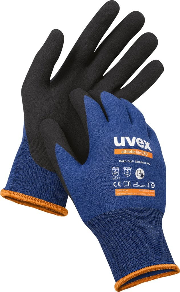 Rękawice antyelektrostatyczne athletic lite ESD. - wykonane z mieszanki poliamidu (PA), elastanu oraz włókna węglowego - powlekane pianką micro-NBR - zakończone ściągaczem - najwyższy współczynnik odporności na ścieranie (4) - wyjątkowo lekkie i czułe, dzięki czemu idealne nadają się do wykonywania precyzyjnych prac mechanicznych - matowa powłoka mikropiankowa o otwartych porach charakteryzuje się bardzo dobrą oddychalnością, wysoką elastycznością i dobrym chwytem - posiadają certyfikat EN16350, dzięki czemu nadają się do użytku w obszarach ESD i zagrożonych wybuchem - polecane do prac z ekranami dotykowymi